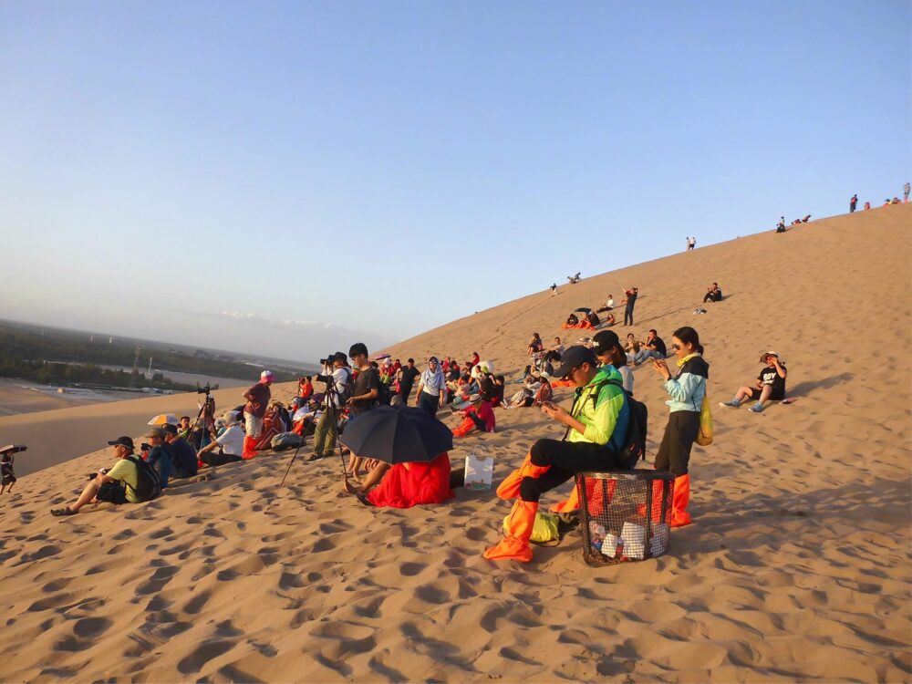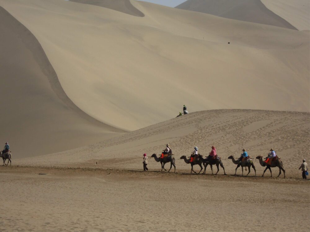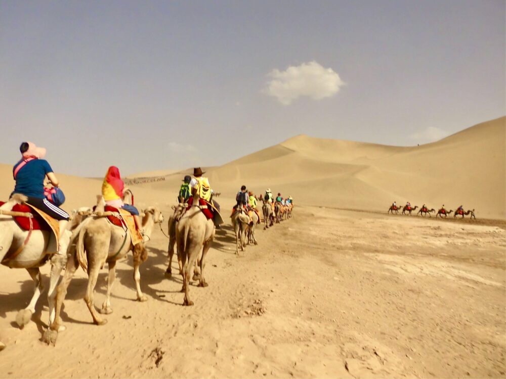 みんなラクダに乗って砂丘の上に登ってる。