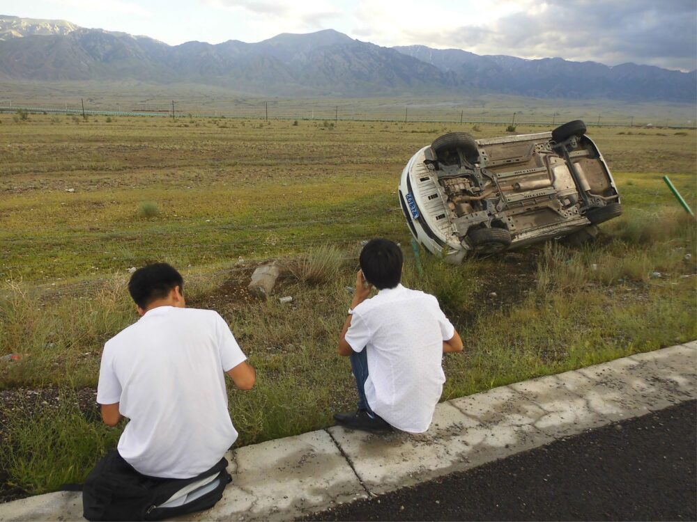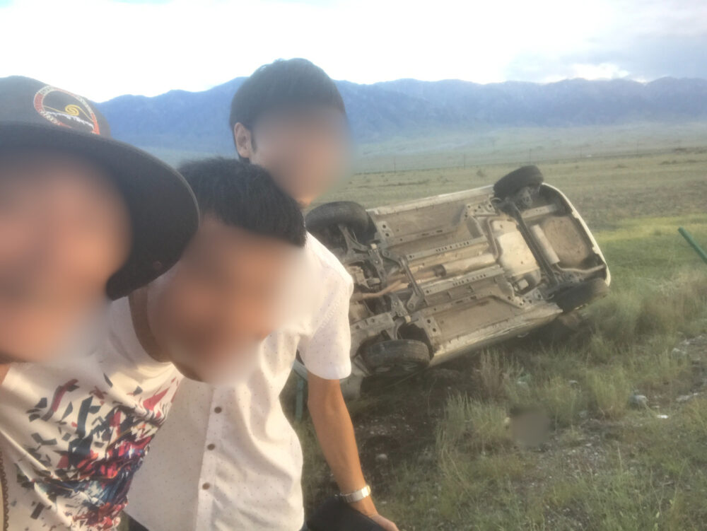 軌道を戻そうとしてるらしいけど、どんどん揺れが大きくなり、ヤバい!!と思ったのも束の間、左側のフェンスに突っ込んで車がひっくり返った。一瞬の出来事すぎて何が何だか分からなかった。
